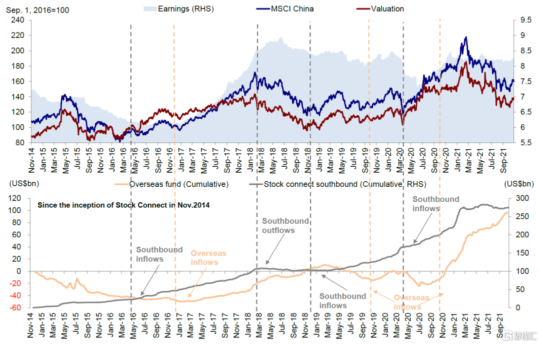 往前看,考虑到H股市场存在的优势,我们认为明年南向资金相对而言可能利好市场表现,而海外资金流入可能存在不确定性。