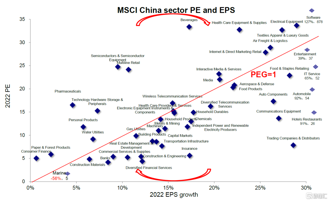 图表:每股盈利增速更高而且市盈率较为合理的成长板块