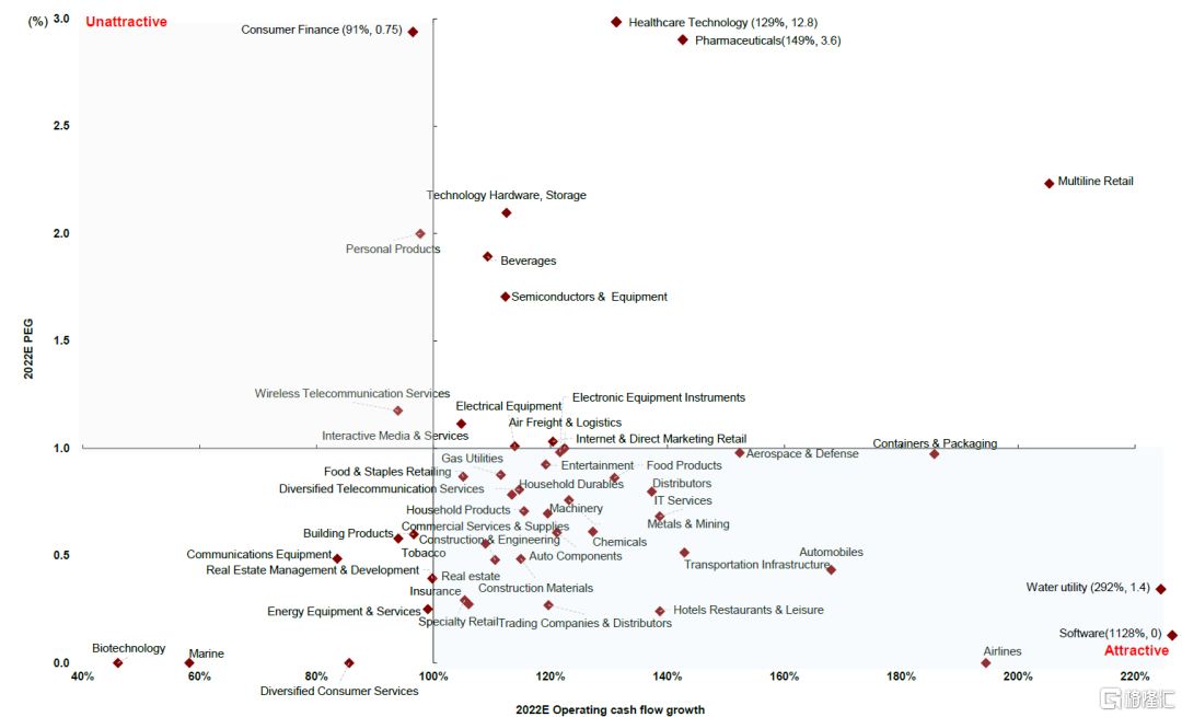 我们认为位于右下角的软件、水务公用事业、航空、交运基础设施、航天、国防、酒店餐饮娱乐、烟草、多元化电信服务、金属采掘、化工、汽车、信息技术服务和建材等板块的经营性现金流预计有较高成长性,且其盈利能力相对较强。