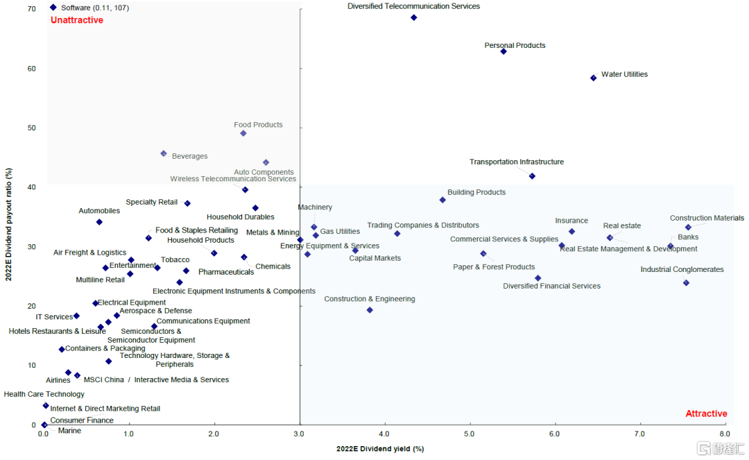 高股息将是低利率环境下的稳健收益之选,可以通过增加被动受益来抵御经济下行周期。与此同时,合理的派息率也至关重要。因此,我们首选高股息收益率、派息率合理偏低的个股。基于图表62中的散点图,我们认为右下角中的综合企业、多元金融、造纸与林业、银行、保险、商业服务、建筑与工程以及建材板块的股息率通常较高且派息率较为合理,可能具有投资潜力。