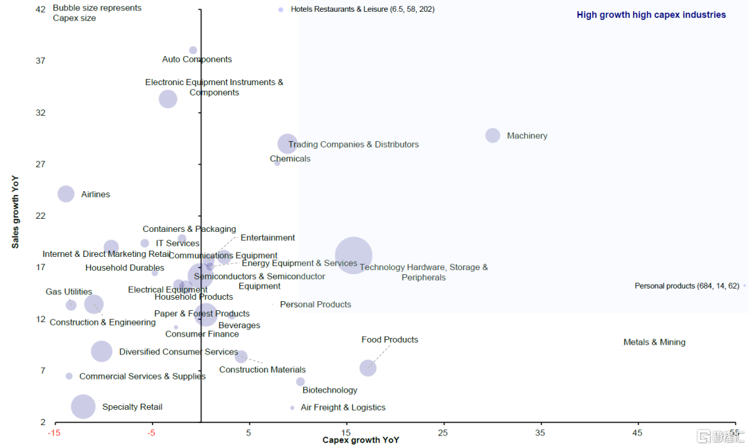另外,我们继续推荐收入较高且资本支出增速也较高的板块,因为收入与资本开支增速可以作为企业成长前景与上升周期的关键指标。我们建议超配未来12个月收入和资本开支增速有望达到两位数的行业,例如机械、个人产品、贸易企业和经销商、科技硬件、存储与外部设备、金属与采掘以及生物科技。