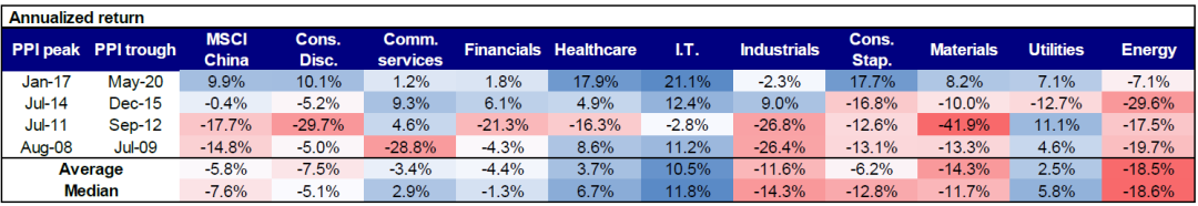 反通胀期间的市场表现方面,从历史上来看,PPI下降的时点通常与经济增长放缓和股市表现低迷的时点相吻合。在PPI大幅下降的较长一段时间内,MSCI中国指数平均每年下跌5.8%。板块方面,能源、工业和材料等周期性板块明显跑输大盘,而信息技术、医疗保健、公用事业和通信服务等板块则跑赢大盘。