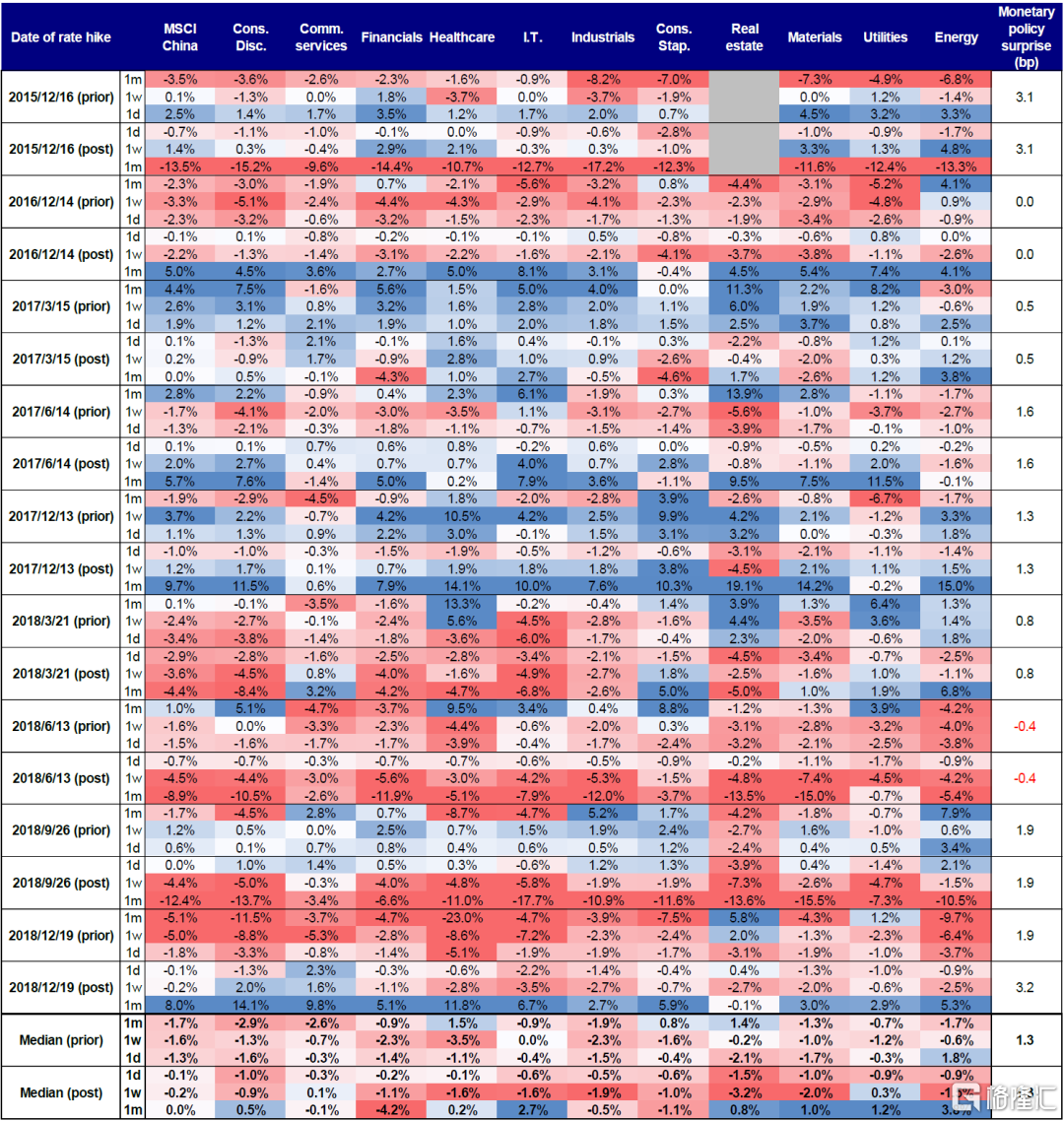图表:2015年以来美联储加息后MSCI中国指数表现一览