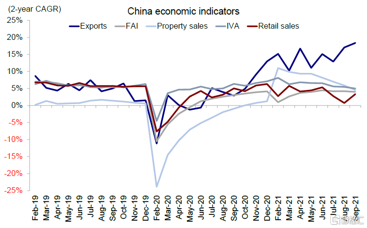 图表:2021年2季度以来中国经济数据呈现增长放缓势头