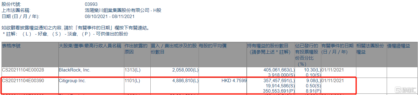 格隆汇APP获悉,根据联交所最新权益披露资料显示,2021年11月1日,洛阳钼业(03993.HK)获Citigroup Inc.在场内以每股均价4.7599港元增持好仓488.68万股,涉资约2326.1万港元。
