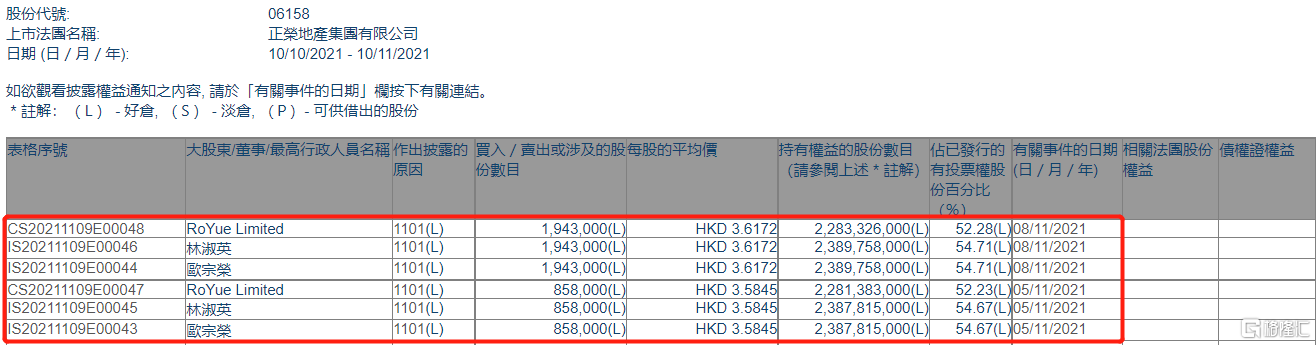 格隆汇APP获悉,根据联交所最新权益披露资料显示,2021年11月5日-11月8日,正荣地产(06158.HK)获股东欧宗荣在场内以每股均价3.5845-3.6172港元合计增持280.1万股,涉资约1008.6万港元。