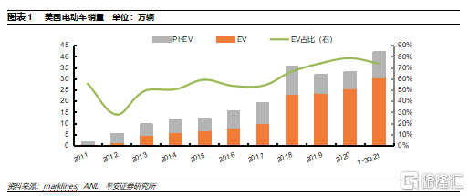 美国新能源车重回高增长。美国电动车市场起步于2010年左右,2011年销量1.8万辆左右,2020年为33.2万辆,复合增速38%。2018年受到爆款车型Model 3上市的带动,全年电动车销量同比17年增长83%,其中纯电车型销量同比增长125%;特朗普上台后并未给予新能源汽车实质上的补贴支持政策,导致18-20年连续三年电动车销量处于30-40万区间上下波动,整体销量处于停滞状态。拜登政府领导下新能源车的发展重回正轨,除特斯拉外,美国本土车企也纷纷加快新能源汽车的转型,在政策和供给端的共振下,美国新能源车拐点向上,重回高增长。21年1-9月美国新能源车销量达到42万辆,同比翻倍以上增长。
