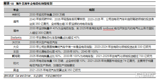 主流车企加快电动化转型。美国本土车企加快电动化进程,福特规划2030年电动化率达到40%,通用在2035年实现轻型车零排放,两大车企在2025年之前在电动化领域的投资高达300-400亿元,同时分别与SKI和LG成立电池合资公司布局电池生产。另一方面,欧、日、韩系车企也加大美国市场的投入,大众规划2030年在美国销售的汽车中有一半是全电动车型,本田2040年北美电动化率达到100%,现代在2025年之前向美国市场投资74亿美元布局电动化转型。