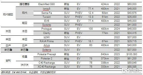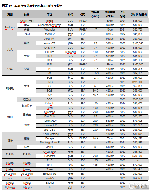 新车型集中上市,优质供给周期来临。2021年后各大主机厂纷纷推出新的电气化车型,美国市场迎来新一轮新品周期,轿车、SUV、皮卡全面突进,优质供给有望刺激消费需求爆发。其中,大众、戴姆勒、通用、福特、现代起亚等传统主机厂车型较多,Rivian、Fisker、Lordstown、Lucid、Nikola等造车新势力也将陆续推出旗下新产品。新车型当中EV产品占比较大,单车带电量普遍在70kWh以上,EPA续航普遍在300英里以上,大电池、长续航趋势明显。