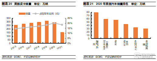 皮卡为美国重要车型,Cybertruck、福特F系列引领电动化浪潮。皮卡为美国汽车市场重要的细分领域之一,2020年美国皮卡销量达到293万辆,同比下降5.8%,占美国轻型车销量比例约20%;美国轻型车销量前三甲福特F系列、雪佛兰Silverado和RAM皆为皮卡车型,且旗下最畅销的F-150、Silverado1500和RAM1500将分别于22-24年推出电动版。此外,新势力车型Cybertruck、Rivian R1T、Lordstown Endurance、Nikola Badger、Bollinger B2也将相继推出抢占电动皮卡市场。我们认为皮卡在美国市场拥有广泛的群众基础,单一车型对电动车增量的贡献将比较显著。