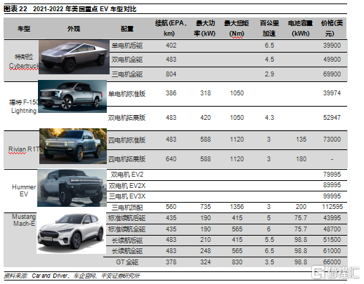 美国纯电车以大电池、大扭矩为特色。以2021-2022年即将上市的重点车型来看,EV车型多为大电池、大扭矩的中大型车,在车身大小和动力性能方面与中欧市场有明显区别。在续航方面,EPA工况下最高续航超过800km,SUV单车带电量最高接近100kWh,皮卡在100-200kWh之间;在动力性能方面,多款车型都有两台电机以上的配置,SUV车型最大扭矩在400-850Nm之间,而皮卡最大扭矩超过1000Nm,百公里加速最快低于3s。在价格方面,部分车型价格已经逼近甚至低于燃油版价格;以福特F-150为例,燃油版指导价为2.93万美元,纯电版起步价为4万美元,考虑7500美元补贴,则购买价为3.25万美元,与燃油车型只有3000美元的差距;若补贴提升至1.25万美元,则购买价只需要2.75万美元,低于燃油版价格;在政策补贴的支持下,部分车型性价比突出,对销量形成强有力的支撑。