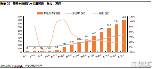 预计2030年美国电动车销量达到900万辆。在政策的支持和供给周期的推动下,预计21年美国新能源汽车销量达到66万辆,同比翻倍,渗透率4%;2025年新能源汽车销量354万辆,渗透率20%;2030年新能源汽车销量900万辆,实现50%的中期渗透率目标,2020-2030年十年复合增速39%,美国将成为全球新能源汽车新的增长动能。