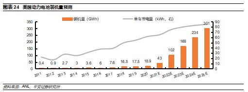 预计2025年美国动力电池需求超300GWh。随着高电量车型的增加和续航里程的提升,美国电动车平均带电量处于持续提升的状态,2011年单车带电量仅22kWh,总装机量0.4GWh;2020年带电量大幅提升至60kWh以上,总装机量近19GWh。预计随着更高电量的乘用车和大电量皮卡车型的推出,单车带电量将继续提升。预计2025年单车带电量达到85kWh,总装机量超过300GWh。