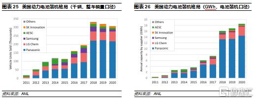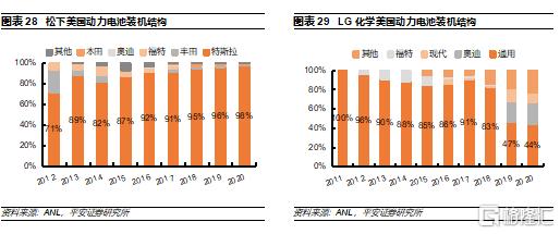 韩系厂商更具增长潜力,未来市占率有望提升。尽管松下客户较多,但对特斯拉的依赖有加强趋势,近三年来特斯拉在其出货中的占比超过95%。除特斯拉外,松下对其他车企的供货多为早期车型,近年来新上市车型更多选用了韩系厂商的电池。考虑到韩系厂商在美国工厂的扩产更加激进、与本土车企加强合资绑定,并且LG也已经进入特斯拉供应链,我们认为韩系厂商在美国市场的市占率将会提升。
