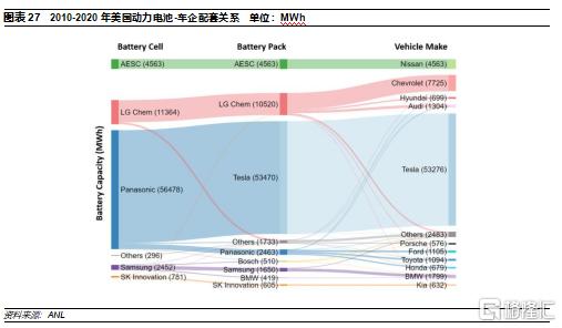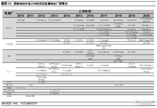 松下LG车型配套广泛,其他厂商客户较为单一。作为前两大供应商,松下和LG在美国拥有较为广泛的客户基础,松下客户包括特斯拉、丰田、本田、福特、奥迪等,LG客户包括通用、福特、现代、奥迪等。除此之外,其他电池厂商对单一客户的依赖比较明显,如三星主要供应宝马、AESC唯一供应日产聆风。