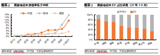 1)渗透率远远落后于中欧。在政策的支持和供给的放量助推下,中欧电动车渗透率呈现快速上涨的趋势,21年1-9月欧洲/中国/美国渗透率接近16%/12%/3.5%,其中9月单月已接近23%/18%/4.5%,美国仍远落后于中欧市场。在中欧市场的刺激下,美国电动车渗透率有望加速向上。