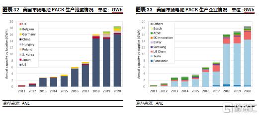 目前美国PACK行业本土化制造比率已经接近90%,生产厂商主要包括传统电池厂、特斯拉和宝马等主机厂、博世等第三方企业,特斯拉采购松下电芯自行设计和生产PACK,在该领域占据了美国市场绝对的主导地位;通用、起亚、日产等车企则交由电池厂生产。