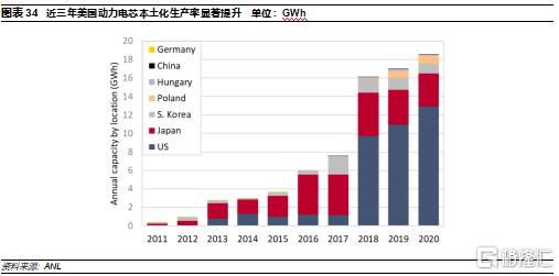 日韩企业纷纷建厂,本土化生产率逐步提升。在特斯拉与松下的合资工厂Gigafactory1投产以前,美国本土的电芯生产比例较低,特斯拉的电芯主要依靠日本进口。2018年随着超级工厂电池产能的释放以及Model 3产能瓶颈的突破,电芯生产的本土化率大幅提升,2020年超过70%;而进口来源主要为日韩厂商在本土工厂、欧洲波兰和匈牙利的工厂等。随着韩国电池厂加大美国市场的产能建设,美国动力电芯的本土制造化比率有望进一步提升。