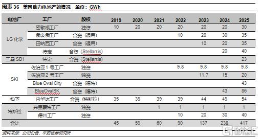 SKI:SKI在美国的第一座工厂于19年一季度开始建设,产能9.8GWh,预计22年一季度投产;第二座工厂于20年三季度开始建设,预计23年一季度开始出货。此外,SKI计划与福特共同投资114亿美元设立两座工厂,规划总产能达到129GWh。到2025年,SKI规划在美总产能超过150GWh。