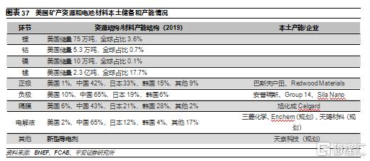 矿产资源:根据FCAB发布的国家锂电蓝图审查数据显示,美国本土的锂、镍、钴资源储备较少,锰资源相对丰富。美国计划到2025年,与合作伙伴/同盟国建立上游原材料供应体系,支持美国本土研发和开矿工作,并且制定相关政策;到2030年,开发出不含钴和镍的锂电池,并且整合资源回收。