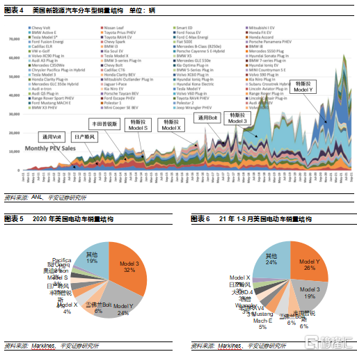 美国纯电占比较高,渗透率落后于中欧。与中欧相比,美国电动车呈现以下两个特点: