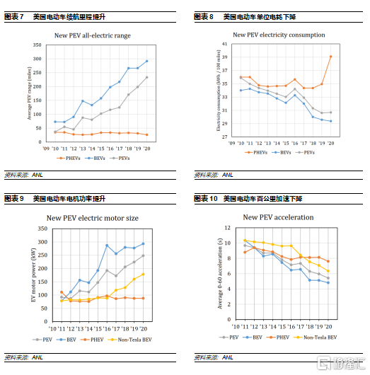 4)在加速方面,美国EV车型百公里加速由2011年的超10s下降至2020年的低于5s,而20年非特斯拉车型的平均百公里加速高于6s。