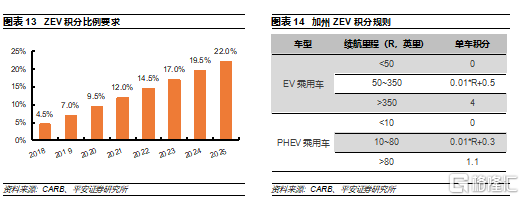单车积分存在上限,积分比例不断提升。在现有ZEV政策法规下,新能源车型获得的积分与续航里程具有正相关关系,纯电车型的积分上限为4分,插电车型为1.1分,与此同时,积分比例处于不断提升的过程中,2021年积分比例要求为12%,2025年计划达到22%,年均提升2.5%。在单车积分存在上限且积分比例不断提升的背景下,政策对零排放汽车的生产数量提出了更高的要求。