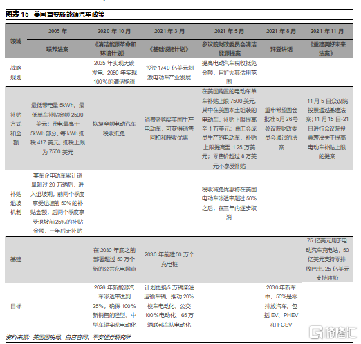1)明确提出新能源汽车的渗透率目标。2020年拜登在竞选提案《清洁能源革命和环境计划》中首次提出2026年美国新能源汽车渗透率达到25%的目标,之后在2021年8月再次追加2030年渗透率达到50%的目标,对美国电动车市场的中长期发展给出了较为明确的指引。