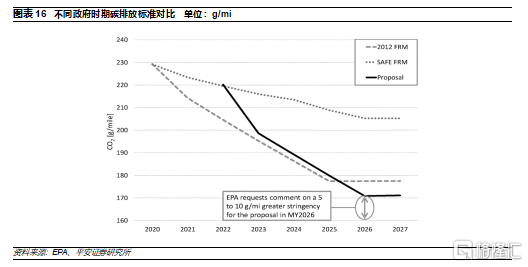 1)碳排放目标值趋严。从奥巴马执政开始,政府针对汽车碳排放先后经历了三轮政策调整。2012年版本规划从2021年开始,碳排放标准每年下降约5%,2025年之后轻型车平均碳排放要达到177g/mi;特朗普时期(2020年版SAFE)将年降标准大幅降低至1.5%,2026年之后碳排放只需满足205g/mi;拜登政府恢复奥巴马时期的政策思路,在最新提案中(Proposal)将2023年的碳排放降幅改为10%。2024-2026年降幅改为5%,预计到2026年标准达到171g/mi,其中乘用车和轻卡的目标值分别达到142、199g/mi(销量假设50:50)。新提案进一步加大了车企的减排压力。