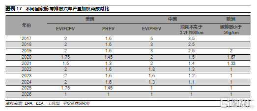 碳排放标准趋严,零排放车型激励延续。美国汽车碳排放目标是由美国环保署(EPA)制定的针对轻型车油耗的一项约束政策,车企通过每一车型碳排放实际值和标准值的差距获得正积分或者负积分,积分可以通过不同车企之间的交易、同一车企不同车型之间的转移、向后结转(5年)或者借贷(3年)以弥补负积分,满足当年的碳排放要求,积分不足的车型将被禁止销售。21年8月5日,EPA发布《乘用车和卡车温室气体排放法规》,提议在2026年之前设定严格的碳排放要求,加快新车型油耗的下降速度。提案在两个方面有望加速零排放汽车的普及和渗透: