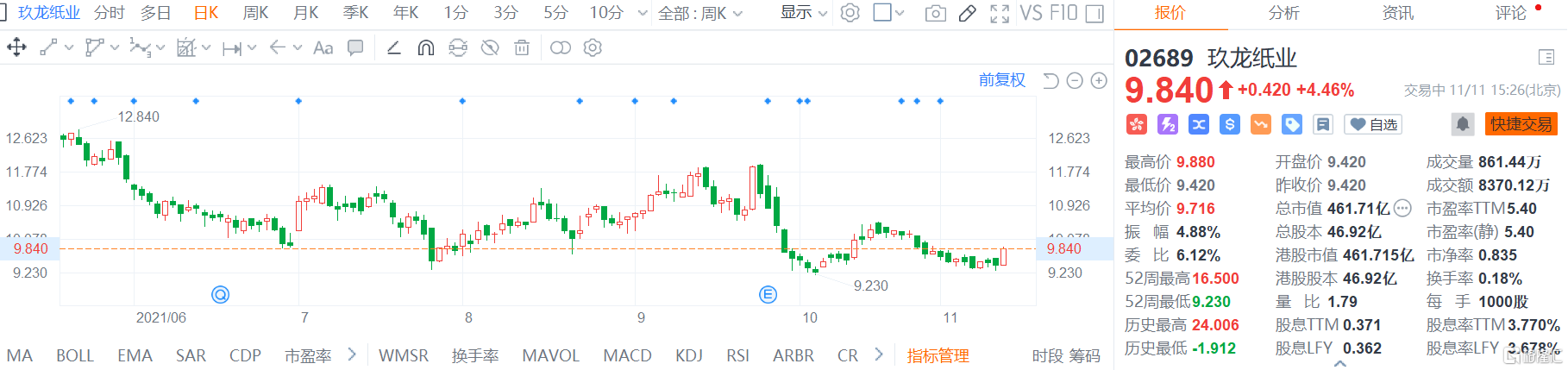 格隆汇11月11日丨玖龙纸业(2689.HK)股价高位震荡,现报9.84港元,涨幅4.46%;理文造纸(2314.HK)跟随涨3.5%,晨鸣纸业(1812.HK)涨1.9%。消息面上,玖龙纸业宣布自11月16日起,东莞、泉州、太仓、天津、重庆以及沈阳基地的瓦楞纸、白板纸等,在原有价格基础上上调100元/吨。