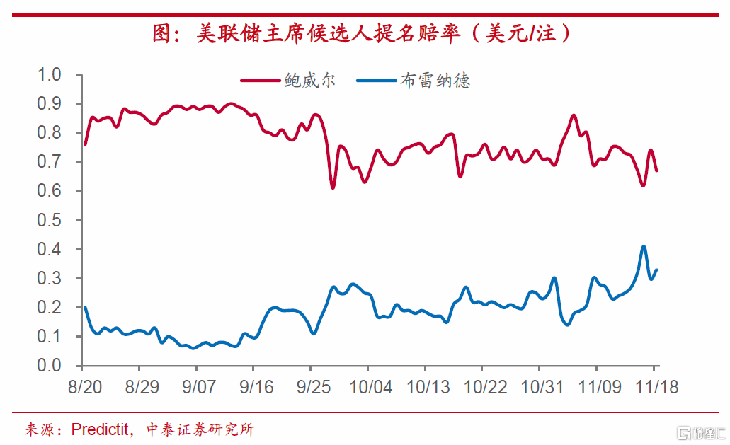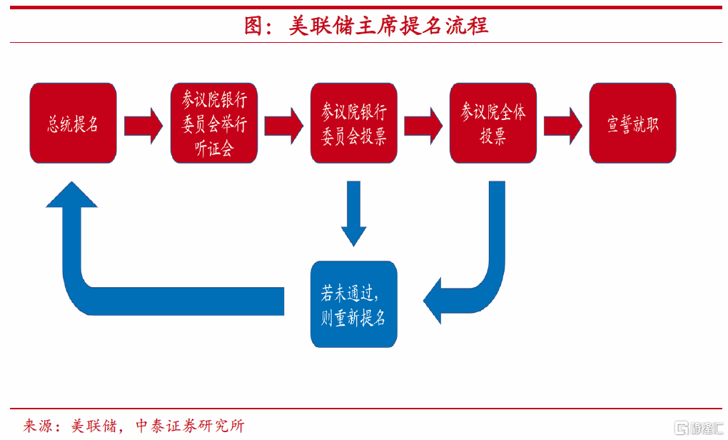 总统尚未提名,时间明显延后。美联储主席人选的确定首先要由总统提名,之后经历参议院的投票环节。从美联储主席提名时间上来看,最近几次总统提名集中在10-11月初,如特朗普在2017年11月初提名鲍威尔,奥巴马2013年10月上旬提名耶伦,小布什2005年10月底提名伯南克,更早如奥巴马2009年8月底提名伯南克连任。但还没有出现11月下旬仍未提名的情况。近日,拜登透露消息,将于感恩节前(11月25日)进行提名。在总统提名之后,参议院银行委员会举行听证会,并进行简单多数表决,表决通过则由参议院进行简单多数表决,中间若有环节未通过,则由总统重新提名。任命的主席于第二年2月宣誓就职。