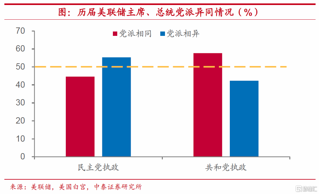 民主党对非本党美联储主席的容忍度更高。我们对自1914年以来的历届美联储主席、总统党派异同情况进行了统计,结果表明,同一时期美联储主席和总统党派相异的情况并不少见。而且,相比较而言,在民主党执政时期,对于来自共和党的美联储主席容忍程度更高,民主党执政期间有超过55%的年份美联储主席曾来自共和党。