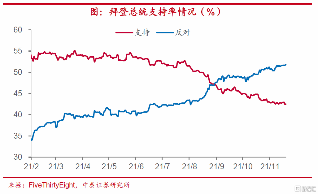 另一方面,2022年是拜登任期内的中期选举。纵观历次美国中期选举,其结果通常对总统所在的执政党不利。自1934年开始的历次中期选举,总统所在政党平均在众议院中失去29席,在参议院中失去4席。考虑到拜登支持率持续走低,目前面临较大压力,为了稳住明年中期选举,使得民主党政府获得选民的支持,可能会选择货币政策观点更为鸽派,与政府配合度较高的候选人。