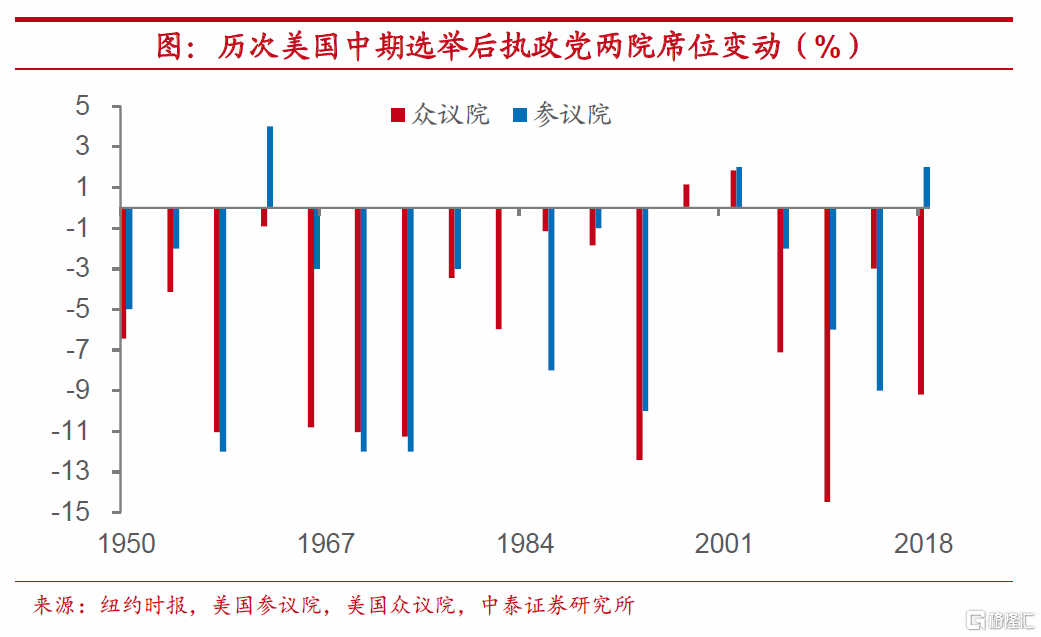 总统如何选择美联储主席?美联储主席人选的确定首先要由总统提名,之后经历参议院的投票环节。从美联储主席提名时间上来看,这次明显延后。回顾美联储历史,在任总统更倾向选择乐意“配合”的美联储主席。我们对自1914年以来的历届美联储主席、总统党派情况进行了统计,结果表明,同一时期美联储主席和总统党派相异的情况并不少见。而且,相比较而言,在民主党执政时期,对于来自共和党的美联储主席容忍程度更高。较以往相比,本次美联储主席提名背景有其特殊性:一方面,提名现任美联储主席鲍威尔的特朗普并未连任总统,而拜登目前民众支持率持续走低。另一方面,2022年是拜登任期内的中期选举,纵观历次美国中期选举,其结果通常对总统所在的执政党不利。