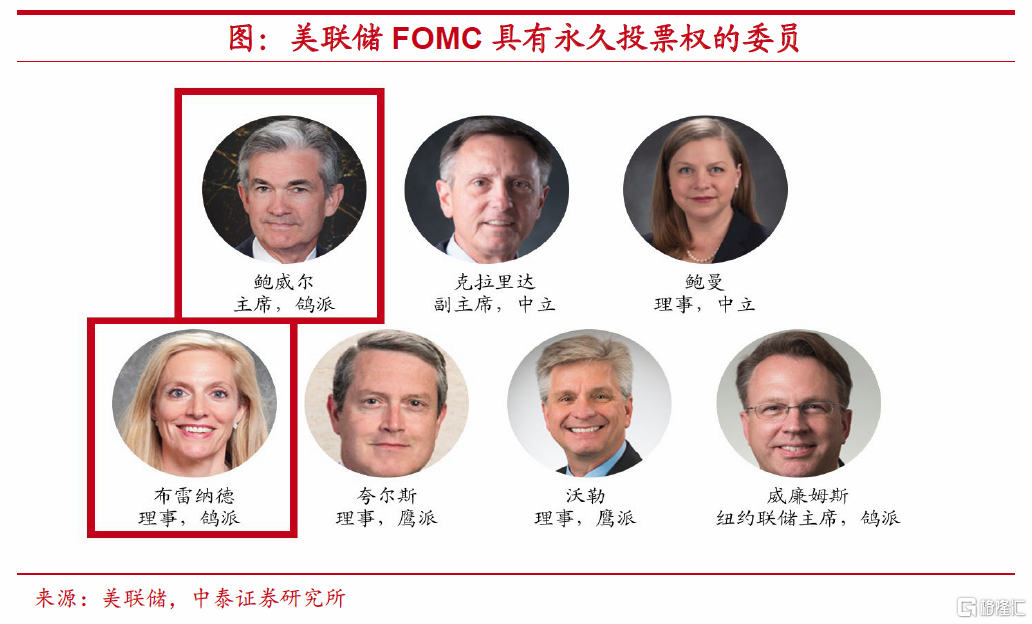 竞争者布雷纳德与鲍威尔有何不同?目前鲍威尔最大的竞争对手是布雷纳德。与法学出身,投行、私募为工作背景的鲍威尔不同,布雷纳德是哈佛大学经济学博士,麻省理工大学应用经济学副教授,具备丰富的经济学学术背景,并曾于2010年-2013年担任美国财政部副部长。与鲍威尔相比,布雷纳德更为关注就业问题,她曾表示,在实现充分就业前应不急于加息,此外,她也更加关注少数群体和低收入群体的就业问题。鲍威尔和布雷纳德都对通胀都有较高的容忍度,在货币政策方面,二者皆为鸽派。但相较于鲍威尔,布雷纳德鸽派程度更深。二者在金融监管、气候和数字货币等方面看法也有差异。