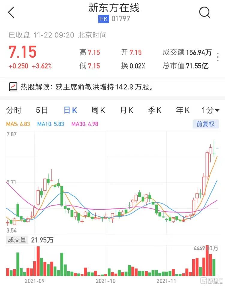 港股异动 | 新东方在线(1797.HK)高开3.62% 获主席俞敏洪增持142.9万股
