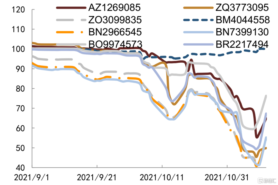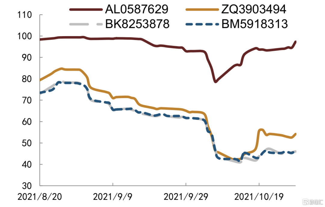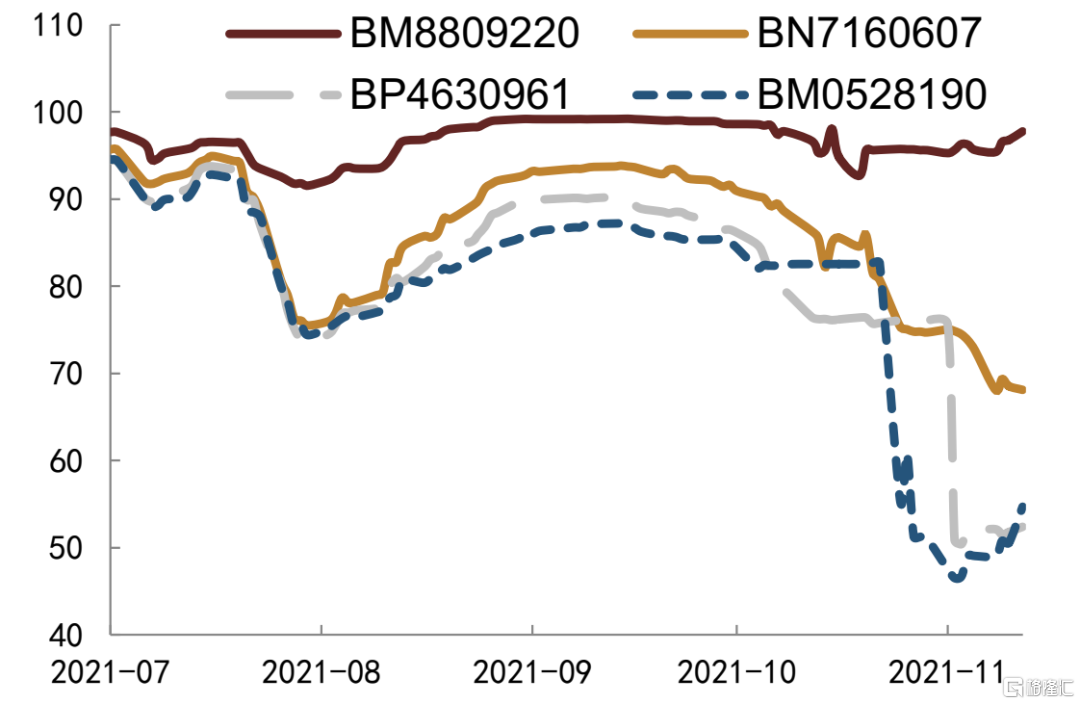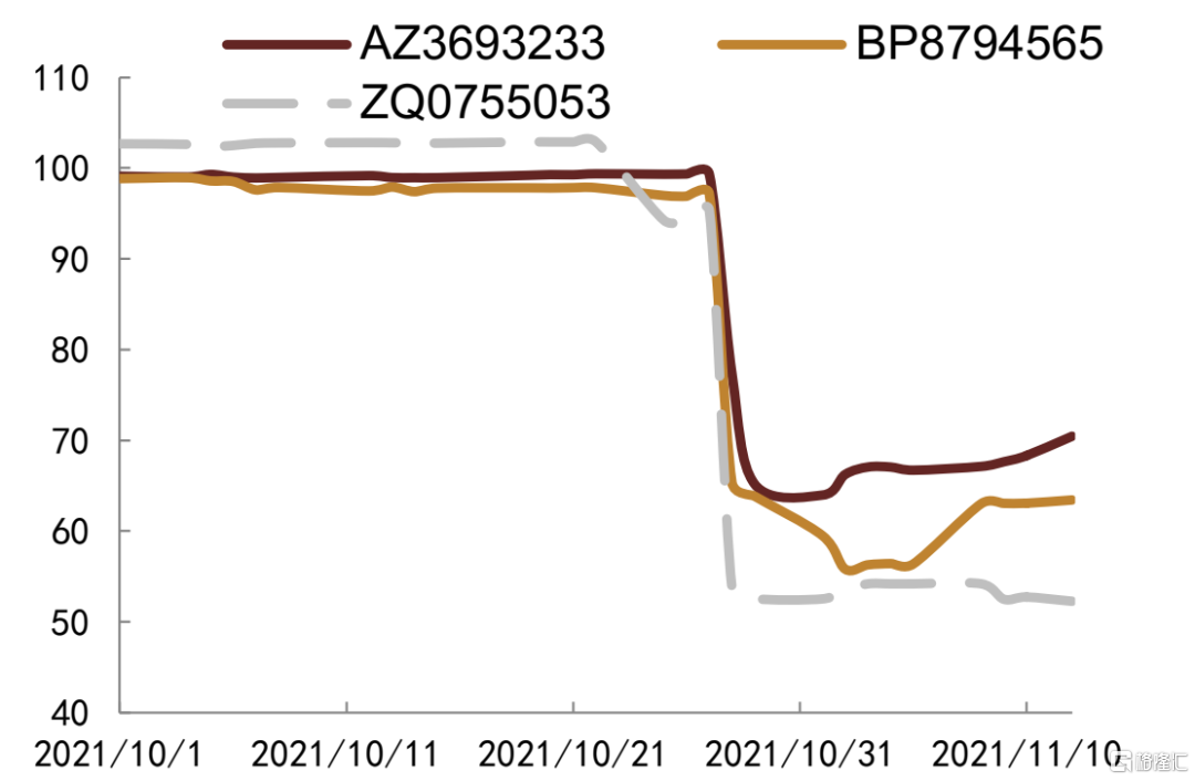 今年以来地产债价格波动较大,我们重点观测地产主体要约回购对债券价格的影响。中梁控股2021年5月10日公吿称拟对2021年6月到期的美元债发起要约回购,当日该只美元债价格上涨0.37美分至100.426美分,其余存续美元债在公吿当日也出现不同程度涨幅,但是在公吿次日大多数都有所回落,短期来看,回购债券公吿日后5日均价略高于公吿日前5日均价,不过整体幅度较小,其余存续美元债则涨跌互现。远洋集团2021年4月21日公吿拟对2021年月7月到期的美元债发起要约回购,当日该只美元债上涨0.028美分至100.152美分,随后几日价格较为稳定,未出现较大幅度波动,其余存续美元债价格并未出现上行,反而大多数美元债价格有所下行。佳源国际2021年7月29日公吿称拟对2022年和2023年到期的两只美元债发起要约回购,公吿当日或次日两只美元债价格均有所上行,其中2023年到期美元债价格上行幅度更大,最大上行0.84美分,且公吿日后5日均价也高于公吿日前5日均价0.37美分,其余存续美元债价格走势不一,未见明显趋势。龙光集团11月3日公吿称拟对2022年1月到期美元债发起要约回购,公吿日该只美元债上涨2.7美分至97美分以上,其余存续美元债均有不同程度上涨,但是次日开始便陆续出现下滑。整体来看,要约回购对回购债券价格有正面影响,但影响幅度较小且持续时间仅1-2日,对公司其余存续美元债影响不一,未见明显规律。