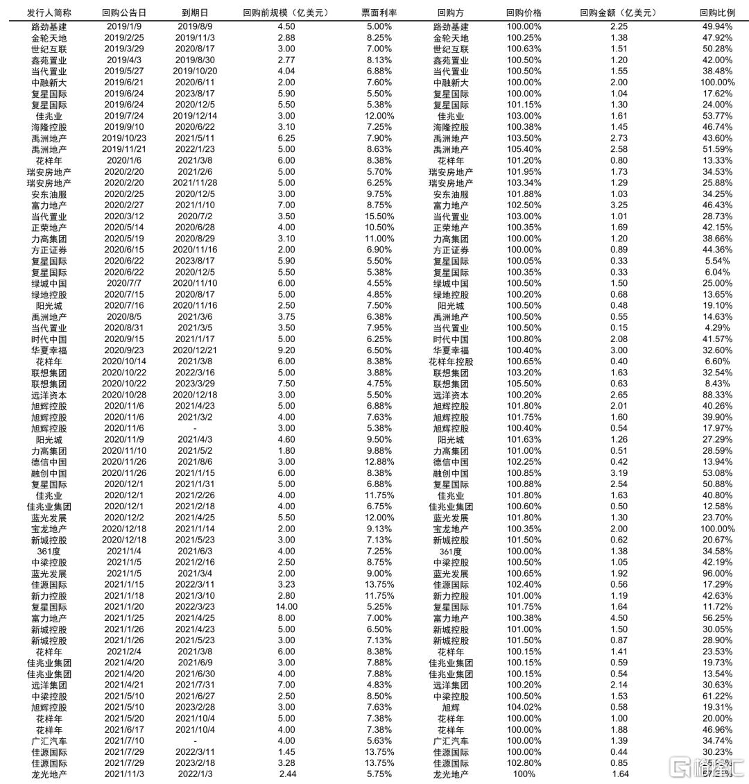 公开市场债券回购通常为二级市场交易价格,同时操作频次更高,但每次金额较小。2021年9月以来中梁控股、建业地产、正荣地产、雅居乐集团、弘阳地产、阳光城、佳源国际均多次公吿称进行回购债券操作。以中梁控股为例,2021年公开市场回购债券次数已经超过20次,其中9月以来达到18次。根据2021年11月12日公吿,中梁控股累计回购2021年11月到期美元债本金总额10347.2万美元,占初始本金总额约51.74%;购回2022年1月到期美元债本金总额2181万美元,占初始本金总额约8.72%;购回2022年5月到期美元债本金总额700万美元,占初始本金总额约2.33%;购回2022年7月到期美元债本金总额1550万美元,占初始本金总额约3.44%。相比于2021年5月中梁控股进行的要约回购,公开市场债券回购操作更为简易且频次更高,能在市场情绪不佳时能更快传递积极信号,不过由于单次回购金额较小,大多美元债合计回购债券规模也相对有限。其余地产主体正荣地产、建业地产、佳源国际、弘阳地产9月以来合计回购债券次数也超过5次,在可统计范围的内大多数美元债回购比例不超过本金10%,回购比例较高的债券一般剩余期限相对较短,或此前已经进行过要约回购。