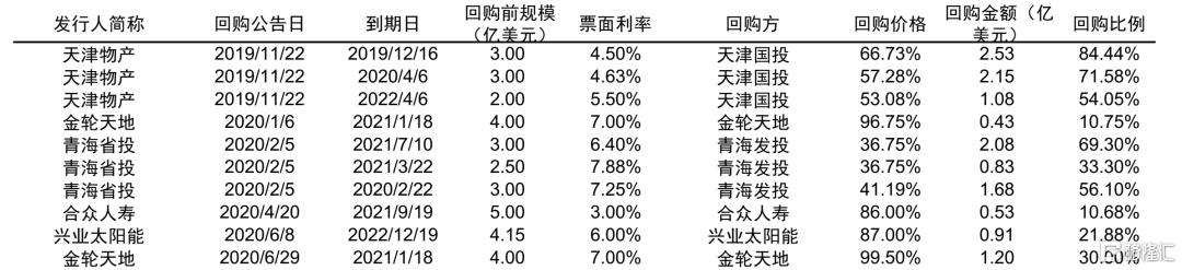虽然中资美元债的回购价格一般在面值的100%及以上,不过也有少数要约回购的价格在面值以下。例如,金轮天地于2020年1月发起收购要约,购买价为每1000美元本金额付款967.5美元(另加应计利息),即按面值的96.75%进行收购要约,这一购买价也基本在彼时二级市场交易价格附近,最终存量金额的11%持有人接受此收购要约。典型的折价要约回购案例还包括青海省投,青海省投是由青海省发展投资有限公司作为要约回购方,对于2020年2月22日到期、2021年7月到期和2021年3月到期的三笔债券,按本金额每1000美元计,要约购买价分别为411.9美元、367.5美元和367.5美元,即购买价为本金额的41.19%、36.75%和36.75%,回购价格基本在二级市场交易价格附近。投资者可选择提交其持有的部分或全部债券,要约人将以现金购买,持有人也可以选择不参与要约。回购要约不设上限,要约人将接纳所有有效提交,同时也不设下限,3笔要约相互独立不互为条件。最终回购要约获得本金总额54.05%的美元债券的有效提交和接纳,其中2020年债券获得56.1%本金的持有人接纳,2021年3月到期债券获得本金额33.3%持有人接纳,2021年7月到期债券获得本金额69.3%持有人接纳。