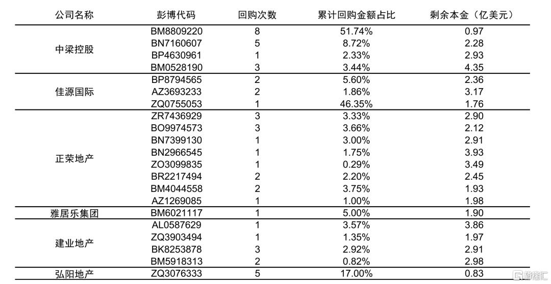 公开市场债券回购通常为二级市场交易价格,一般频次更高,但单次金额较小。2021年9月以来中梁控股、建业地产、正荣地产、弘阳地产、佳源国际均多次公吿称进行公开市场债券回购。