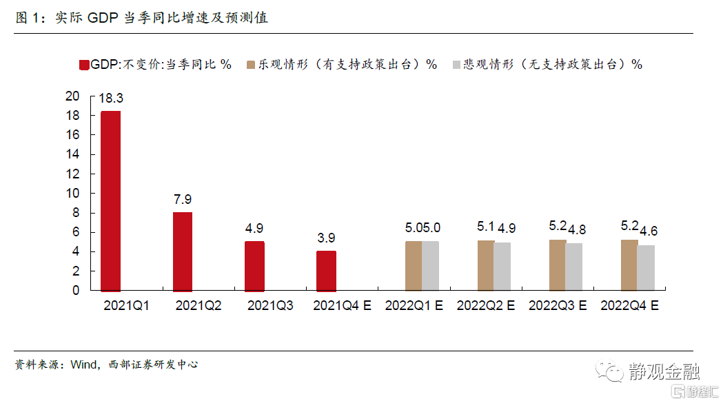展望2022年,内外需同步放缓将加大经济下行压力,国内总量政策有望适度转向稳增长,地产行业或将出台结构性支持政策。据我们测算,若政策如期发力,全年GDP实际同比增速约为5.1%,Q1-Q4或呈前低后高趋势,同比增速分别为5.0%、5.1%、5.2%、5.2%;若无相关支持政策出台,全年同比增速将降至约4.8%,Q1-Q4或呈前高后低趋势,同比增速分别为5.0%、4.9%、4.8%、4.6%。