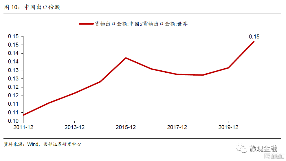 我们曾在9月6日报吿《出口因素驱动的投资逻辑》中指出,2020年Q2以来强劲的中国出口数据背后存在四点驱动力。1)防疫物资:2020年4-12月占中国出口比重为6.94%,对中国出口增速的拉动率为26.1%;2)全球复苏:该因素对2020年4-12月中国出口增速的解释力为32.3%;3)美国财政转移支付下的额外商品需求及美国地产销售热拉动下的地产后周期需求:2014-2018年中国对美国出口增加值占中国出口增加值比重均值为20%,2020年则高达37.74%,进而我们假定2020年中国出口增幅有17.7%由美国因素解释;4)供给替代:前三项对2020年4-12月出口增长的解释力为76.1%,进而我们认为供给替代因素的解释力或约23.9%。