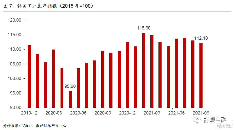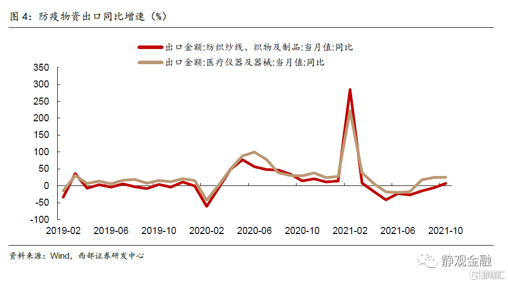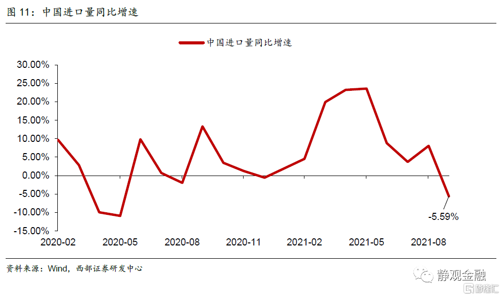 我们在前文提到Q3中国出口实际值(出口量)同比增速已经骤降至个位数,但数据显示Q2中国净出口对实际GDP当季同比拉动为9.7%,Q3反而提升至21.7%。原因在于Q3国内已经开始出现“衰退式顺差”。如下图所示,9月中国进口量同比增速已经转负,加上Q3经济增速显著低于Q2,因此贸易因素对经济增长的贡献反而上升。明年上半年国内经济下行压力较大,不排除延续衰退式顺差格局。但正如我们11月13日报吿《政策转向的信号》中指出的,目前的政策已经在防风险和抑制上游原材料价格过快上涨等方面发力,今后亦有望逐渐转向稳增长。因此,明年中经济企稳的概率仍大,进而明年下半年贸易因素对经济的贡献将有所下降。