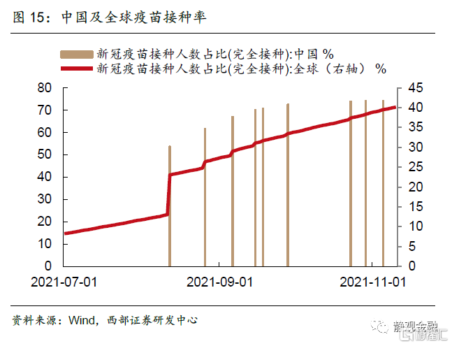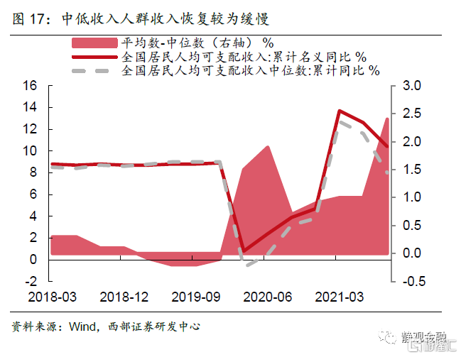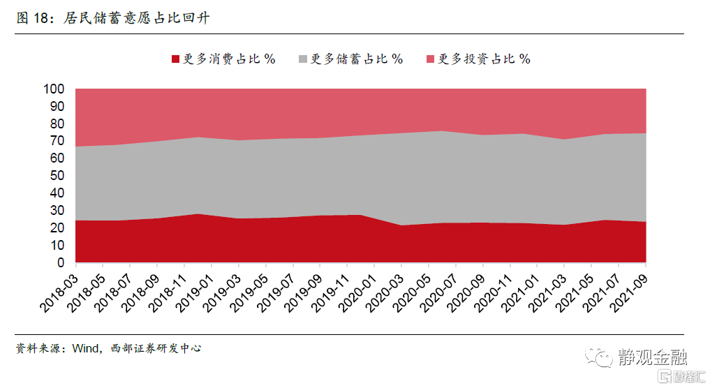 明年疫情对弱势人群就业和收入的掣肘也有望缓解,有利于提振大众消费。从就业来看,疫情之后,在国家保就业、保市场主体等系列政策引导下,城镇调查失业率从2020年2月份的6.2%降至2021年10月的4.9%,已接近疫情前水平。但16-24岁人口调查失业率却居高不下,2021年1-10月平均为14.3%,远高于2019年11.9%的中枢,表明疫情之后弱势群体就业存在较大阻力。从收入来看,2020年在疫情冲击下,全国居民人均可支配收入增速大幅下降,但收入中位数修复速度明显弱于平均数。此外,2021年以来,居民收入的平均数与中位数之差有扩大迹象,Q3达到2.4个百分点,创疫情之后新高,这说明中低收入人群的收入受疫情拖累更为明显。从央行城镇储户调查问卷来看,倾向于更多储蓄的居民占比连续两个季度回升,与疫情之前相比,消费意愿仍然偏弱。若明年疫情影响减弱,青年群体、中低收入等弱势人群的就业和收入都有望改观,有利于提振大众消费。
