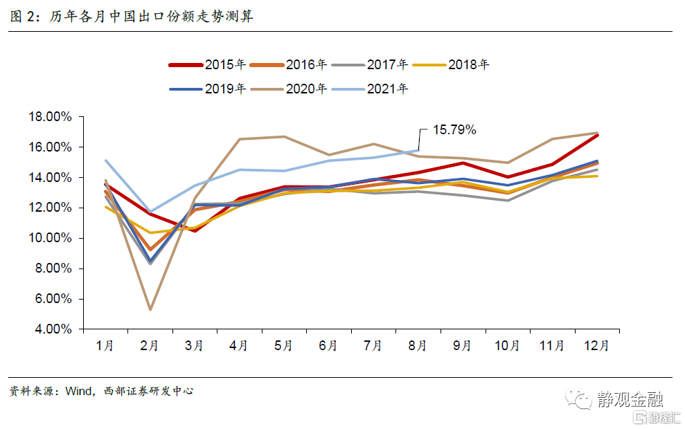 此外,2020年1-8月中国出口份额为13.8%,今年同期提升至14.4%。由于该指标存在季节性,一般Q1最低,Q4最高,因此今年全年中国出口份额很有可能高于去年。今年全年中国出口金额或为33046.8亿美元,同增27.6%,占全球出口份额15.4%。