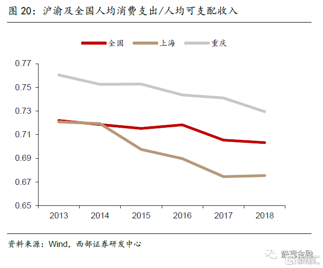 2016年后重庆整体仍保持着较全国更显著的下降趋势,房产税带来了长期的消费支出的抑制。而上海在16-18年基本恢复与国内其他城市一致的消费支出/可支配收入占比走势,说明从长期的角度来看,上海能够自我消化房产税加征对消费支出的抑制效应,房产税对居民消费的影响长期不明显。