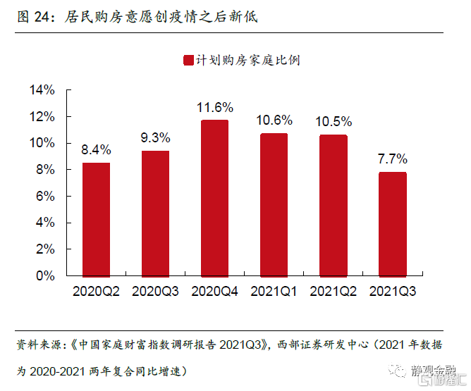 居民购房意愿不足和住房贷款收紧下,地产销售中枢快速回落。今年6月以来,房地产开发投资增速快速下行,1-10月两年复合同比增速仅为6.8%,创年内新低。在地产调控趋紧下,居民购房观望情绪浓厚。《中国家庭财富指数调研报吿2021Q3》显示,我国居民购房意愿今年持续下滑,2021Q3计划购房家庭比例仅为7.7%,远低于2020Q4 11.6%的高点,为疫后新低。居民住房按揭贷款额度的收紧和放款时间的延长亦加大了地产销售压力,2021Q2以来个人购房贷款余额呈加速下行趋势,商品房销售面积和销售额当月两年复合同比增速分别于8月和9月转负,反映当前地产销售承压。