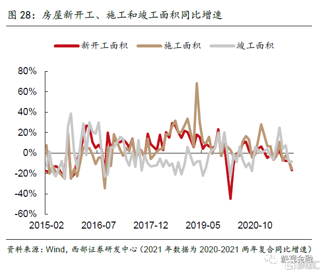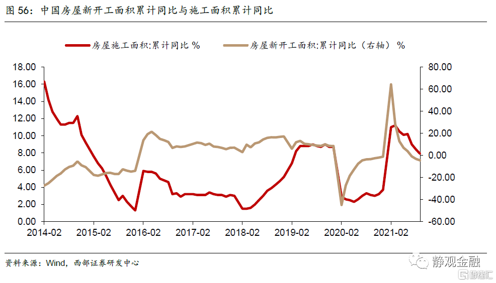 经历了2014-2015年两年新开工面积累计同比负增长后,2015年底房地产施工面积累计同比逼近0,且同期出口实际值同比亦为负增长。在此背景下,2015年12月中央经济工作会议上提出了“三去一降一补”任务,2016年两会的政府工作报吿中又强调了因城施政化解地产库存。2018年地产新开工及施工面积累计同比增速均向好,但Q4出口实际值同比增速骤降并转负,加上美国对华进口商品加征关税使得出口企业承受巨大压力,因此政策再次暂时切换至稳增长。正如前文,明年上半年出口与地产均存在较大下行风险,2022Q1出口增速就有可能转负,因此,明年政策基调有望正式转为稳增长。