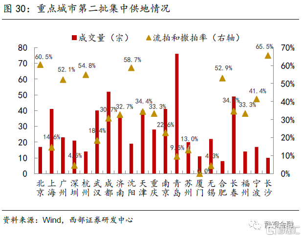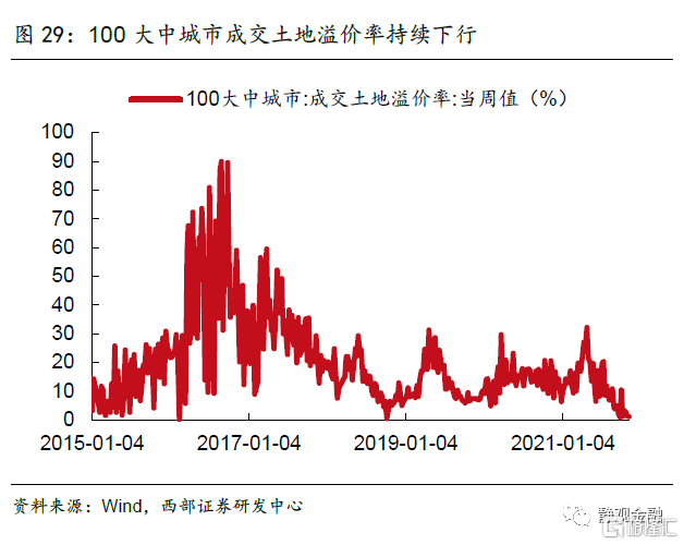 融资渠道趋紧,致使房企拿地和新开工意愿不足。今年在销售回款压力加大、地产融资渠道收紧的影响下,房企开发到位资金增速持续下滑,两年复合同比增速由2月的11.7%快速回落至9月的0.8%。恒大事件等地产债务风险的发生,也降低了金融机构对房企融资的风险偏好,2021Q3房企国内贷款两年复合同比增速仅为-8.7%。在外源融资渠道收紧、销售回款压力加大的情况下,为保持偿债的流动性,房企新开工和拿地意愿明显不足。从当月两年复合同比增速变化来看,房企新开工、施工和竣工面积在三季度全面转负。100大中城市成交土地溢价率持续走低,在重点城市第二批集中供地成交情况来看,半数以上城市流拍+撤拍率超过30%。
